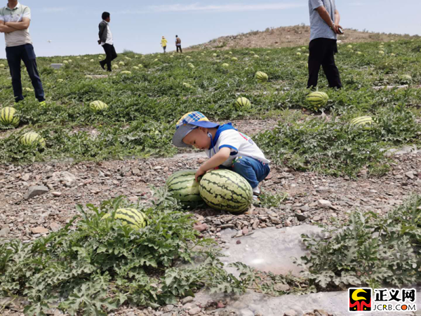 喊叫水乡硒砂瓜成熟时节,村民带着孩子来田地里忙碌和查看。崔晓丽 摄 喊叫水村主要为黄土丘陵、河谷滩地,平均海拔在1500米,年均降水量仅250毫升左右,年蒸发量却高达2000毫升,地下水和地表水均为苦咸水。虽然四季分明,但只能靠天收,种植小杂粮,根本谈不上种植经济作物和发展种植产业。“这里最缺的是水,不缺的是穷。”喊叫水村村主任卫平说,2005年村里的人均年收入只有500元。 穷则思变。2006年,中宁县乡两级党委、政府大力推行中卫市“百万亩硒砂瓜工程”,由政府牵头、干部带头,帮助农民种西瓜,协助农民售西瓜,积极兑现种植补贴政策。“刚开始村民不理解为啥好好的土地要盖上砂土种西瓜,我们就耐心入户讲解,让农民放心。”苗卫平说,第一年种植硒砂瓜1000亩,产量100万斤,全村硒砂瓜收入实现20万元,人均可支配收入实现了翻番。