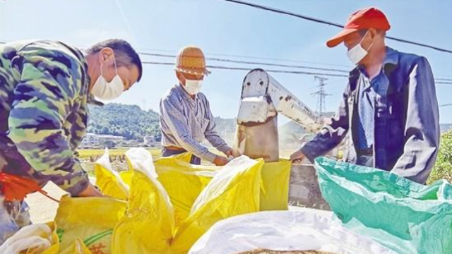 10月10日,记者在南兴村看到,山间农田已满眼金黄,饱满的稻穗随风摇曳。一台收割机在稻田里穿梭工作,田边的村道上,村民将收割上来的稻谷摊开晾晒,空气中弥漫着阵阵谷香。记者了解到,今年的稻谷价格比往年更高,每公斤湿谷卖到3.2元,尽管如此,依然有不少收购商前来订粮。