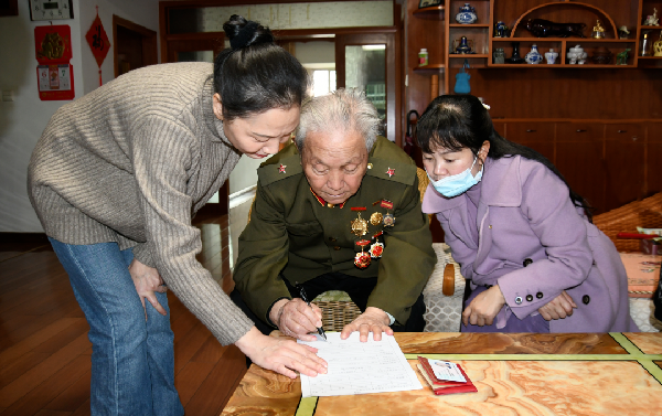 3月7日,龙岩市优待证申领制发服务先锋队志愿者到行动不便的军休干部戴木成家中开展上门服务,采集办证信息,介绍优待证的申领制发流程和合作银行优惠政策。