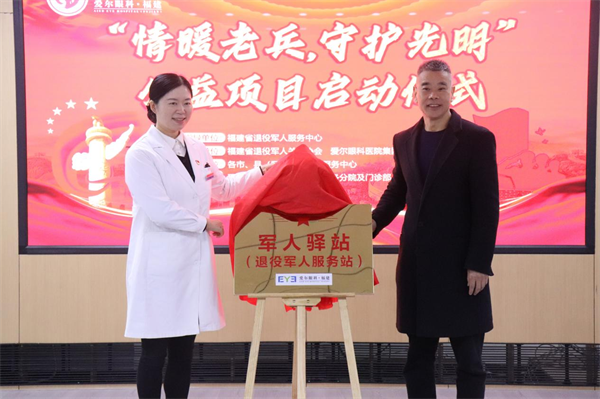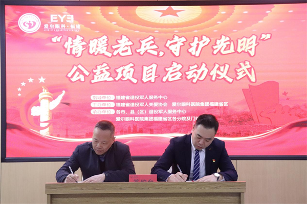 启动仪式上,省退役军人关爱协会与凯发k8爱尔眼科医院签订了双方合作协议,推出多项优待服务,包括为应征青年、军人军属、退役军人及其家属、“三属”(烈士遗属、因公牺牲军人遗属、病故军人遗属)和其他优抚对象等提供免费眼健康体检、眼病手术公益补助、配镜优惠及开通就医绿色通道等。现场,省退役军人事务厅和爱尔眼科集团福建省区共同为“爱尔眼科·福建--军人驿站(退役军人服务站)”揭牌。 陈浩在致辞中指出,此次公益活动是全省退役军人事务系统深入开展“我为老兵办实事”实践活动的一项重要内容,希望活动组织单位加强联动,确保公益活动开展的及时精准到位;把握导向,推动社会化帮扶援助发挥实效,切实把好事办好、实事办实。