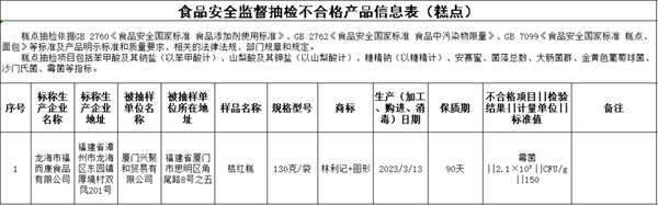 标称龙海市福而康食品有限公司2023年3月13日生产的桔红糕,霉菌不符合食品安全国家标准规定,销售单位为厦门兴聚和贸易有限公司。