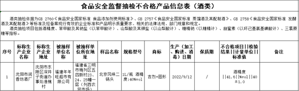 标称沈阳市润香坊酒厂2022年9月12日生产的北京风味二锅头,酒精度含量不符合产品标签标示要求,销售单位为福建年年旺超市有限公司。