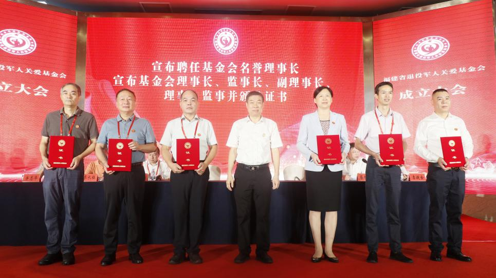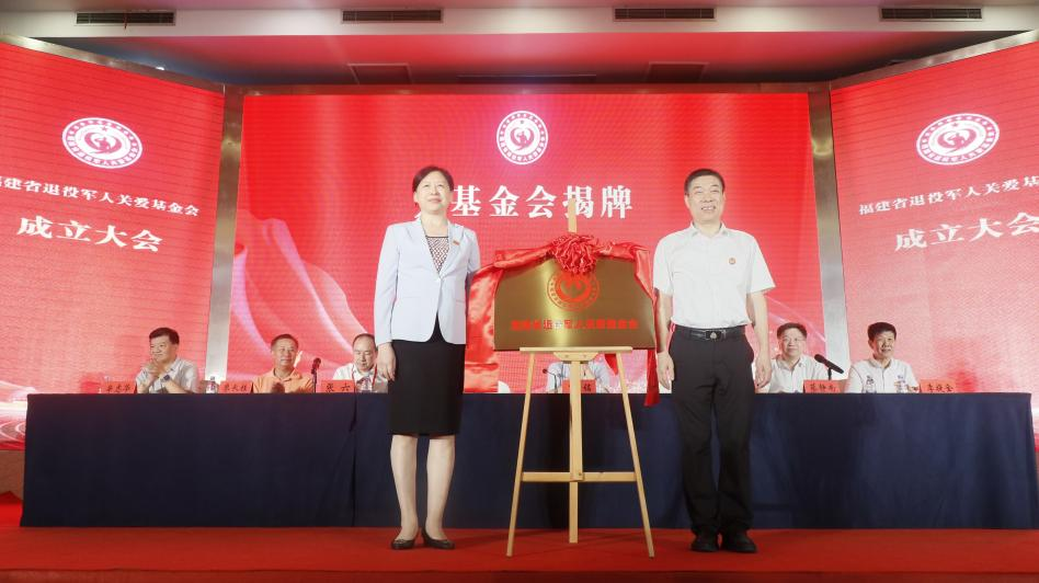 中国退役军人关爱基金会常务副理事长贾铭出席并讲话,省退役军人事务厅党组书记、厅长罗庆春与省退役军人事务厅原一级巡视员、省退役军人关爱基金会理事长郑敏分别讲话并共同为福建省退役军人关爱基金会揭牌。省民政厅二级巡视员张六宣读基金会成立批文并代表省民政厅表示祝贺。
