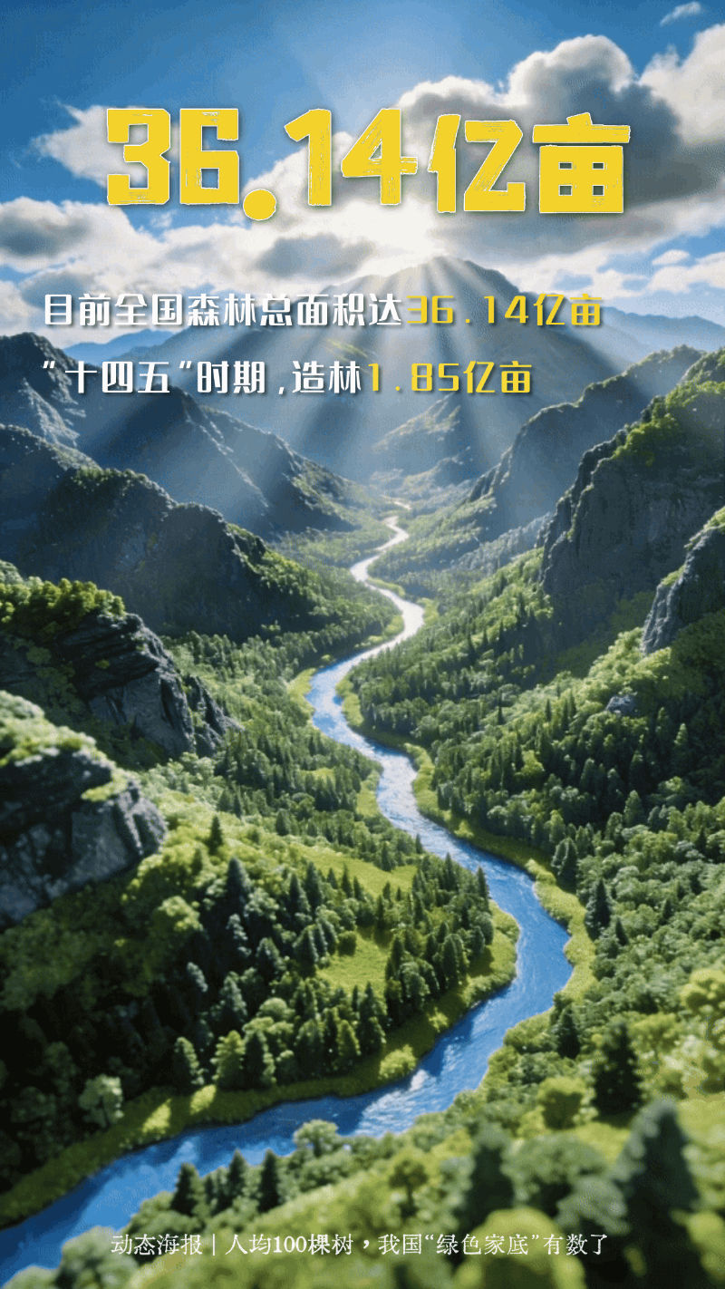 编者按:国家林草局最新数据显示:目前全国森林总面积达36.14亿亩;其中“十四五”时期,我国造林1.85亿亩,面积与福建省相近,成为全球增绿最多最快的国家。一组海报了解我国“绿色家底”和绿色奇迹。