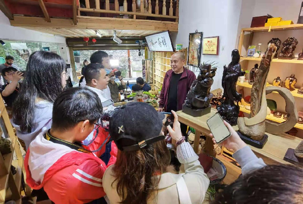 在店头街一角,茶具商人张兴华向游客介绍自己做的茶盘、木雕等物品。20多年前,木工出身的他还在为生计发愁,要想富先修路,张兴华对此深有体会。